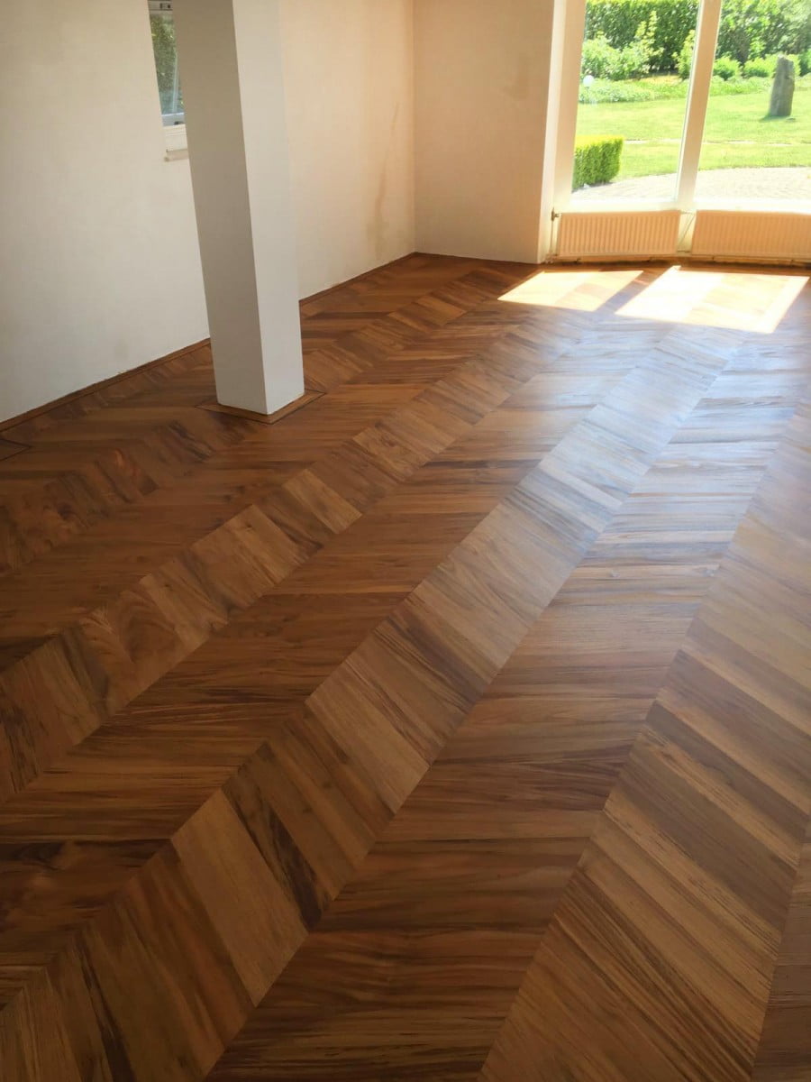 De meeste houten vloeren worden vervaardigd uit eikenhout. Dat is op zichzelf prachtig, maar het is extra bijzonder als wij mogen werken aan een minder alledaagse parketvloer. Neem nu deze teakhouten vloer met een Hongaarse punt als legpatroon. Wij mochten hem schuren en weer als nieuw maken. Dit deden wij door hem af te werken met Monocoat pure. Oordeel zelf!