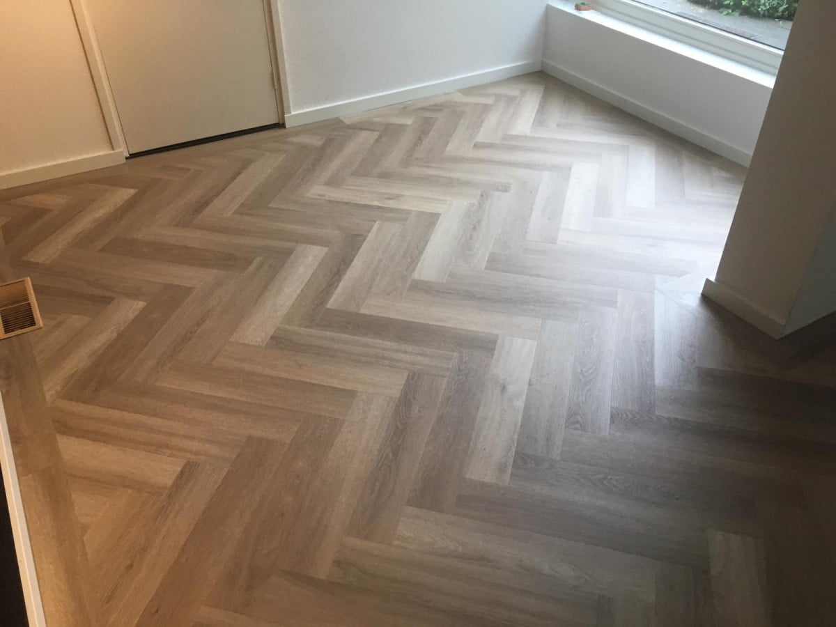 In deze woning in Zevenaar legden wij een schitterende en smaakvolle nieuwe vloer. Geen parketvloer, zoals u aan de hand van de beelden misschien zou vermoeden, maar een PVC vloer. Dankzij het visgraat patroon en de fraaie band rondom is de vloer vrijwel niet van echt te onderscheiden. Zeer onderhoudsarm en kwalitatief top! Voordat de vloer gelegd kon worden, hebben wij de bestaande tegelvloer twee keer geëgaliseerd. Rondom werd de vloer afgewerkt met een MDF plint.